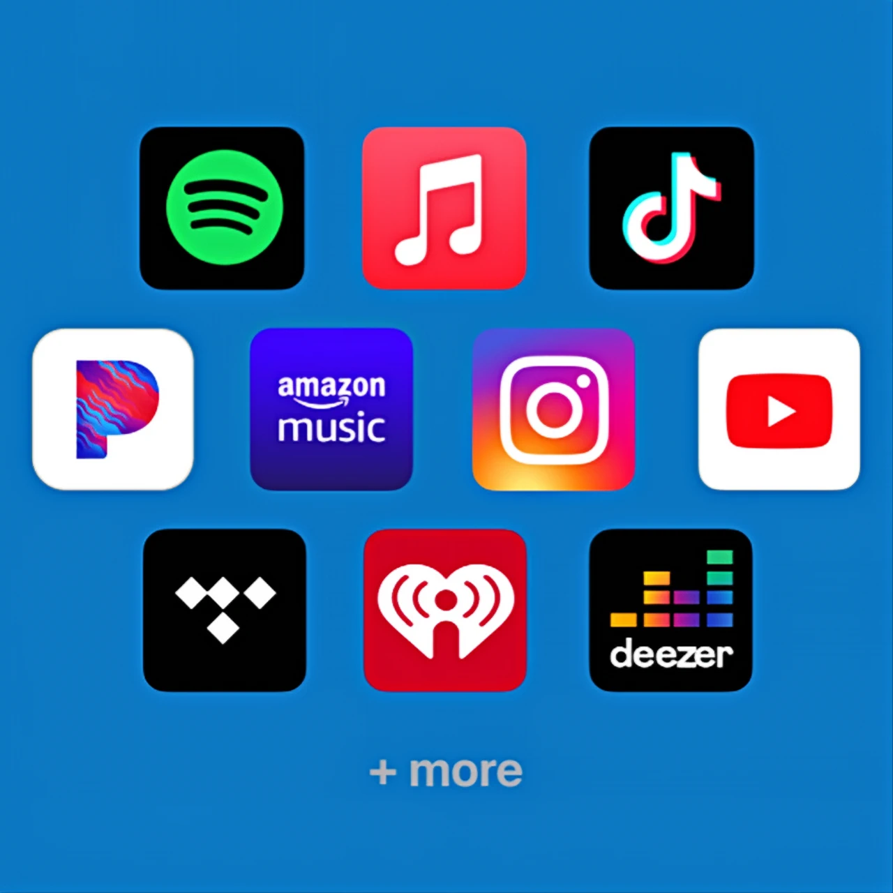 PS: kompletní seznam obchodů a platforem (SpotifyApple MusiciTunes, Instagram/Facebook, TikTok/Resso, Google Play/YouTube, Amazon, Soundtrack by Twitch, Pandora, Deezer, Tidal, Napster, iHeartRadio, ClaroMusica, Saavn, Anghami, KKBox, NetEase (beta), Tencent (beta), Triller (beta), MediaNet ).